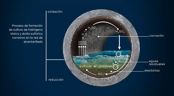 El origen del problema está en la propia naturaleza de las aguas residuales. Cuando las condiciones dentro de la red se vuelven anaeróbicas —algo habitual en colectores con largos tiempos de retención, baja velocidad de circulación o temperaturas elevadas— las bacterias sulfatorreductoras transforman los sulfatos presentes en el agua en sulfuros. Estos sulfuros volátiles se liberan como H₂S gaseoso, que al oxidarse en la zona de la solera y las paredes forma ácido sulfúrico biogénico (H₂SO₄). El resultado es una corrosión progresiva sobre el hormigón y otros materiales de la red que, si no se controla, puede comprometer seriamente la vida útil de las infraestructuras y disparar los costes de mantenimiento y rehabilitación.