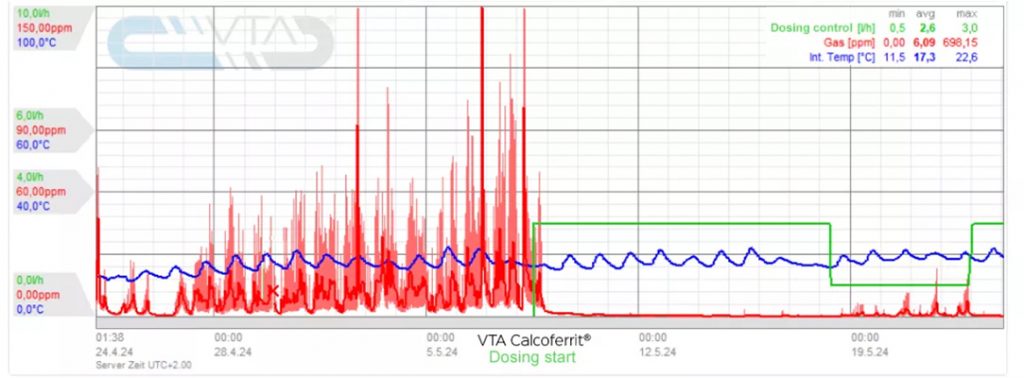 Para aquellos gestores que deseen disponer de datos cuantificados, VTA ofrece adicionalmente la posibilidad de incorporar monitorización en línea de H₂S con dosificación controlada. Esta opción permite documentar con precisión la evolución de las concentraciones antes y después del inicio del tratamiento, facilitando la justificación técnica y económica de la intervención.