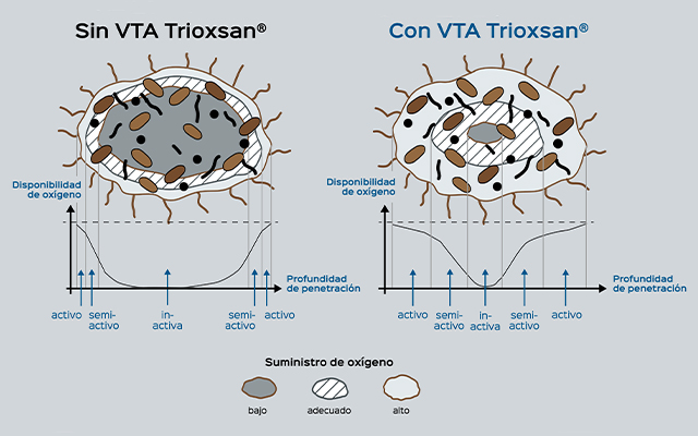 El aporte de una fuente de oxígeno altamente eficaz mediante VTA Trioxsan® mejora la profundidad de penetración del oxígeno dentro del flóculo, activando zonas que, en condiciones convencionales, permanecen inactivas o semi-activas. Esto se traduce en: