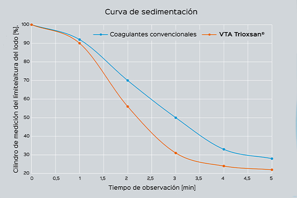 Uno de los efectos más relevantes desde el punto de vista de explotación es la disminución de la producción de fangos precipitados. Frente a los coagulantes férricos, que pueden generar hasta un 65 % más de fangos, VTA Trioxsan® permite reducir la cantidad total de fangos hasta en un 40 %, con el consiguiente impacto positivo en costes de gestión y deshidratación.