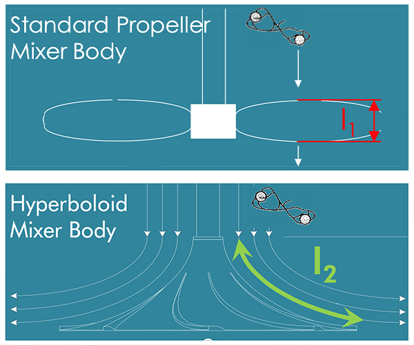 Tal y como se ilustra en la figura comparativa entre un agitador de hélice y un agitador hiperboloide, la forma en que el fluido es acelerado difiere de manera sustancial.