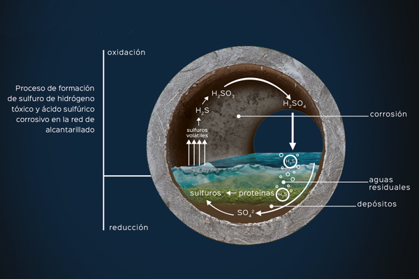 Actúa evitando la formación de sulfuro de hidrógeno (H₂S) y otras sustancias olorosas mediante la inhibición de procesos anaerobios responsables de la generación de gases corrosivos. Al mismo tiempo, neutraliza los olores ya existentes y suprime la producción de ácido sulfúrico biogénico, principal causa de la degradación de conducciones y estructuras de hormigón.